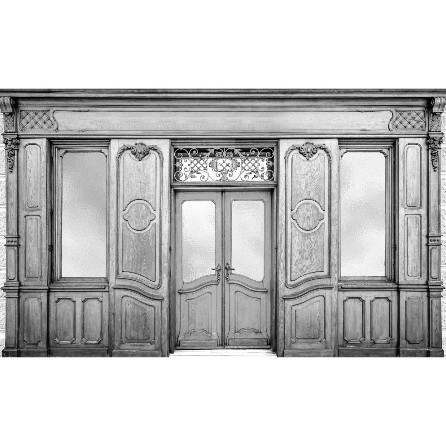La composition révèle une façade architecturale en bois patiné, structurée par de larges panneaux moulurés et une porte centrale à double battant, dont les courbes délicates traduisent l’influence de l’Art Nouveau. Le veinage du bois, restitué avec une précision remarquable, semble avoir conservé la mémoire du temps, tandis que les vitrages texturés diffusent une lumière douce et feutrée, comme filtrée par les années. Surplombant l’ensemble, une ferronnerie ornementale finement ciselée déploie ses arabesques avec élégance, rappelant l’excellence des maîtres artisans d’antan.