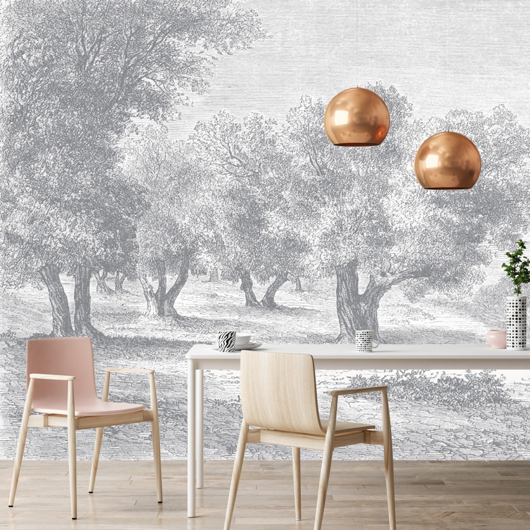 Le papier peint panoramique Gravure Les Oliviers en tonalités de gris, évoque la quiétude des paysages méditerranéens, où les arbres noueux se dressent sous une lumière immobile. Inspiré des gravures anciennes, ce décor mural grisaille déploie une scène végétale délicate, rythmée par les feuillages et les troncs sinueux, comme figés dans le temps.